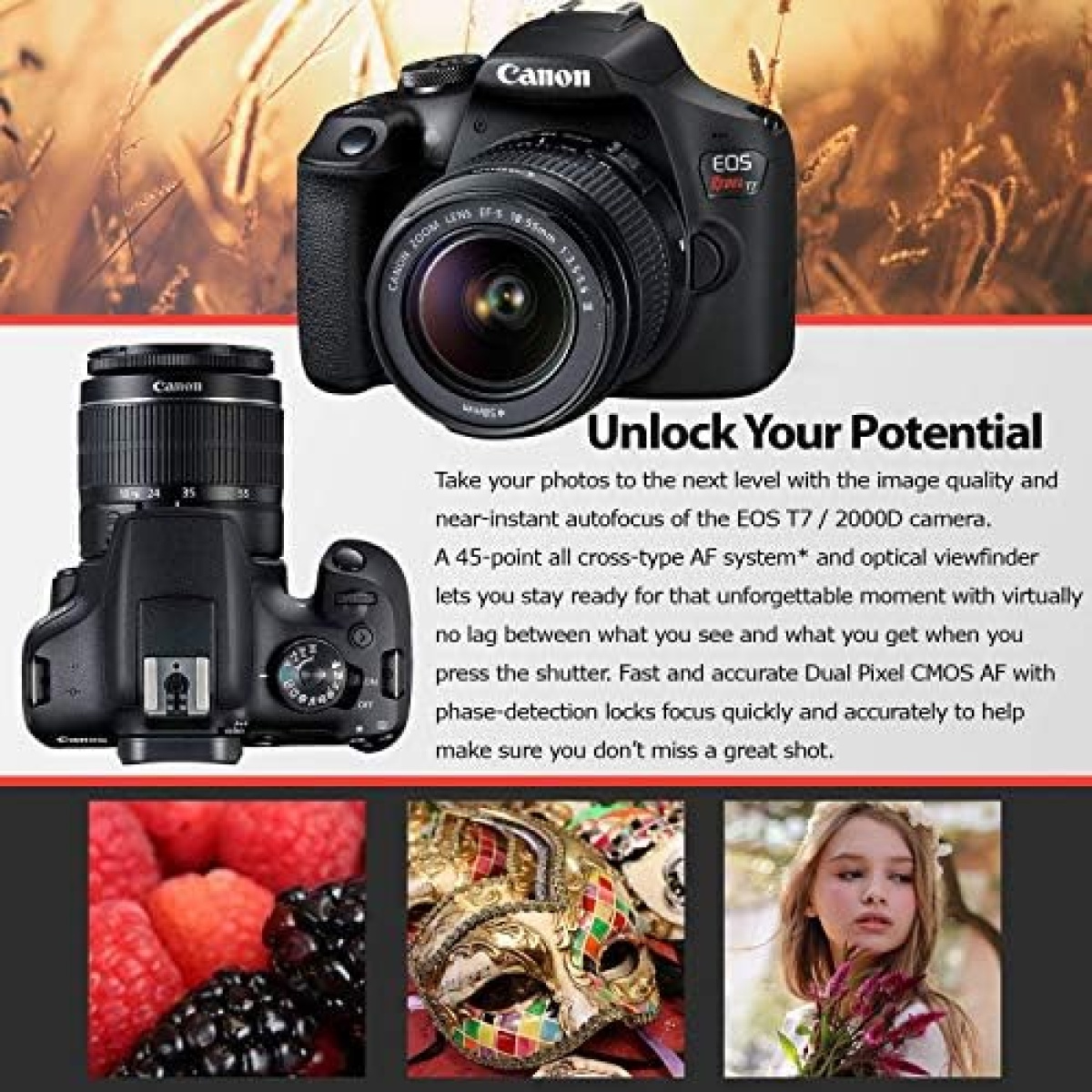 Ideal for mobile device users wanting to take the next step with their photography, the EOS Rebel T7 camera combines fantastic features with easy-to-use operation for high-quality images you’ll be proud to share. Harness the power of the EOS Rebel T7’s large 24.1 Megapixel CMOS sensor to realize your potential for great shots. Share the memories with your friends and family quickly and easily via built-in Wi-Fi and NFC technology. With the EOS Rebel T7’s fast autofocus system, you can capture every moment as it happens, viewing each shot through the bright optical viewfinder. A range of additional features, including a large LCD screen, Full HD video recording and an on-board feature guide help you capture eye-catching photos and video.