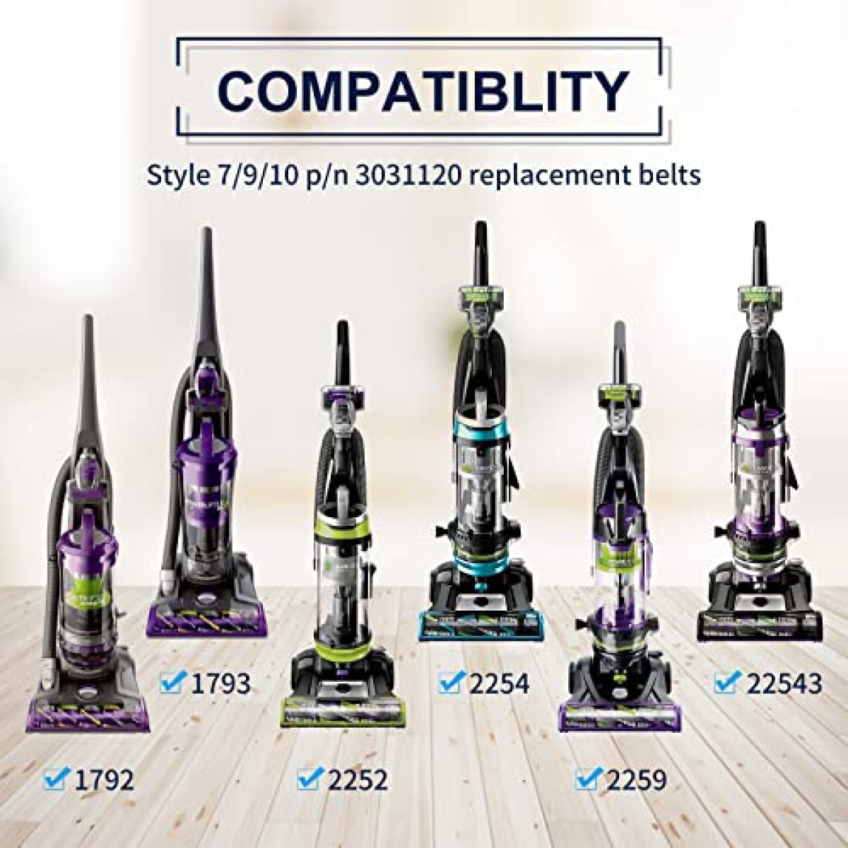 COMPATIBILITY: These 3031120 belt compatible with Bissell vacuum cleaner model 2252, 2260, 2259, 1793, 1792, 2254, 22543, 21K3, 22C1, 3522, 3545, 35451, 35455, 3590, 35931, 3574, 3575, 3576, 3590, 3591, 3593, 3910, 3920, 3594, 3990, 4104, 44M3, 46E5, 6390W, 6579, 6582, 6583, 6584, 6585, 8975, 6590, 6594, 6596, 71Y7, 82G7, 82H1, 92L3P, 92L3