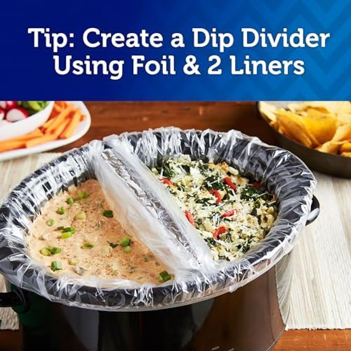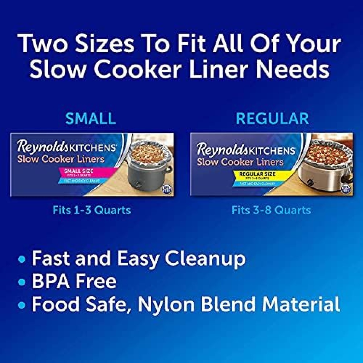 Make memorable meals with Reynolds Kitchens Slow Cooker Liners, and save time on cleanup. Grab these slow cooker bags for slow cooking without dealing with stubborn, stuck-on messes. Simply lift the slow cooker liner when the cooking is done and your slow cooker is clean in less than eight seconds—guaranteed! Each slow cooker bag measures 13 x 21 inches to fit 1- to 3-quart round and oval slow cookers, and is made with a BPA-free heat resistant (up to 400 degrees Fahrenheit) nylon-blend construction. Spend more time with your loved ones and less time in the kitchen with these FDA-compliant, food-safe Reynolds Kitchens Slow Cooker Liners.