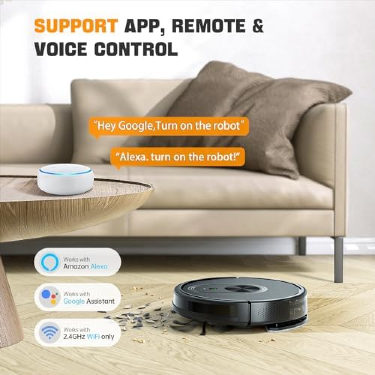 ✅【APP&Remote Intelligent Control&Voice】 The HR101 robot vacuum and mop can be controlled through the remote control and Tuya Smart APP. Many functions such as cleaning direction, mode switching, suction adjustment, and schedule setting can be easily realized through the Tuya Smart APP. The robot vacuum is also compatible with Alexa and Google Assistant and supports voice intelligence control.After connecting Alexa in the Tuya Smart APP, the robot vacuum can be controlled by voice for cleaning tasks.(⚠The APP only supports 2. 4GHz Wi-Fi,not applicable for 5G Wi-Fi.)