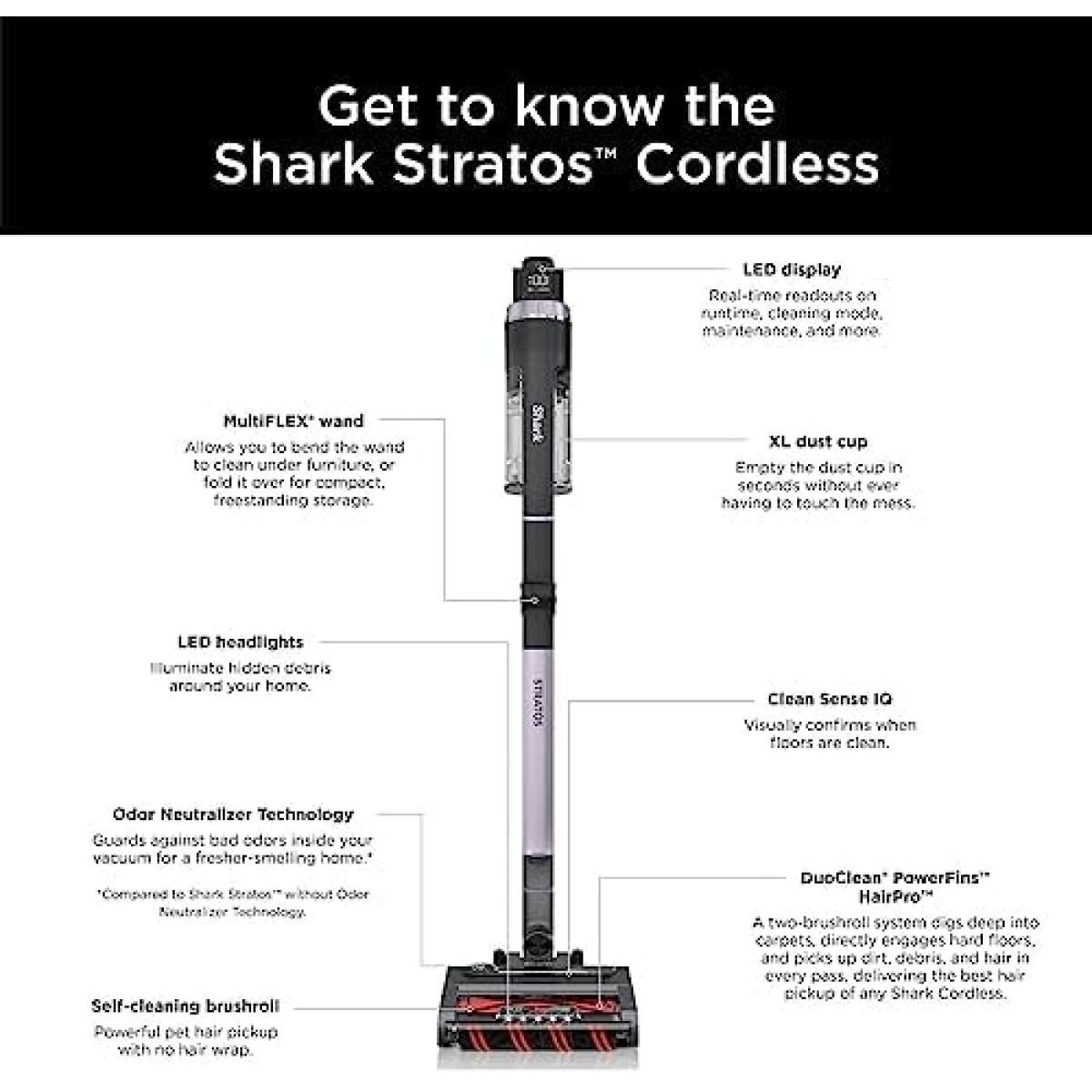 The new Shark Cordless Stratos IZ862H features Clean Sense IQ to detect dirt you can’t see, and automatically boosts power. Stratos has the most powerful suction of any Shark cordless, plus Odor Neutralizer Technology for a fresh-smelling home. Lightweight and easy to maneuver, the DuoClean PowerFins HairPro nozzle delivers the best hair pickup of any Shark cordless stick vacuum.
