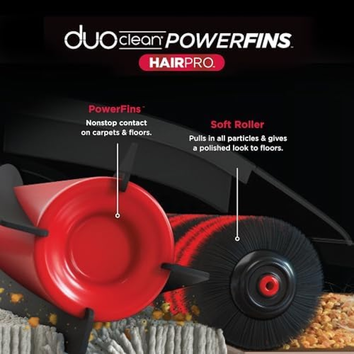 DUOCLEAN POWERFINS HAIRPRO: Two brushroll system digs deep into carpets, engages hard floors, and picks up dirt, debris, and hair in every pass. No cordless vacuum picks up hair better*. (*From floor to dust cup, third party tested on human/pet hair)