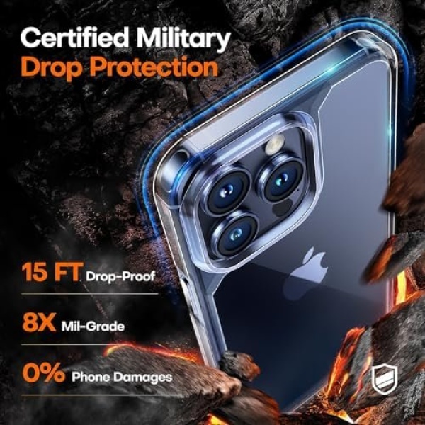 【15FT Military-grade Protection】TAURI for iPhone 15 Pro Case Clear is certified drop test, combines a soft-frame and hard PC back cover with 4 built-in corner Airbags to absorb impact, can prevent your phone from accidental drops, bumps and scratches.